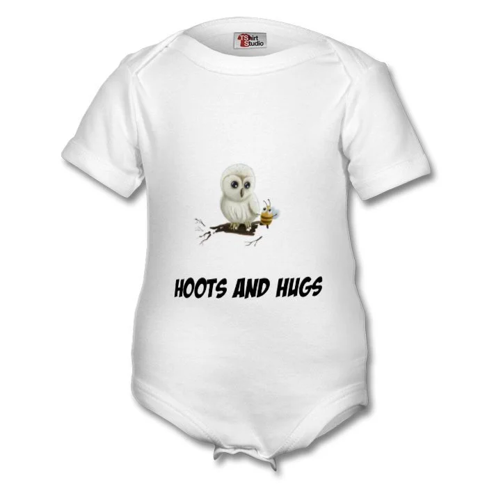 Adorable "Hoots and Hugs" Baby Grow featuring Clarence the owl and Bertie the bee.